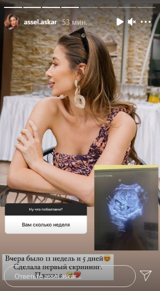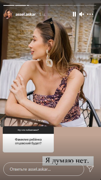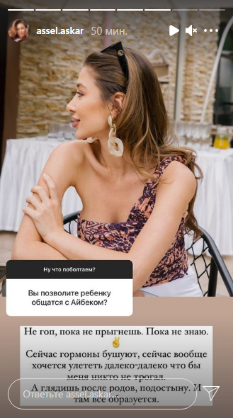 Насчёт того, позволит ли она Айбеку общаться с их ребёнком, Аскар написала: "Не гоп, пока не прыгнешь. Пока не знаю. Сейчас гормоны бушуют, сейчас вообще хочется улететь далеко-далеко, чтобы никто меня не трогал. А глядишь, после родов и подостыну. А там всё и образуется".