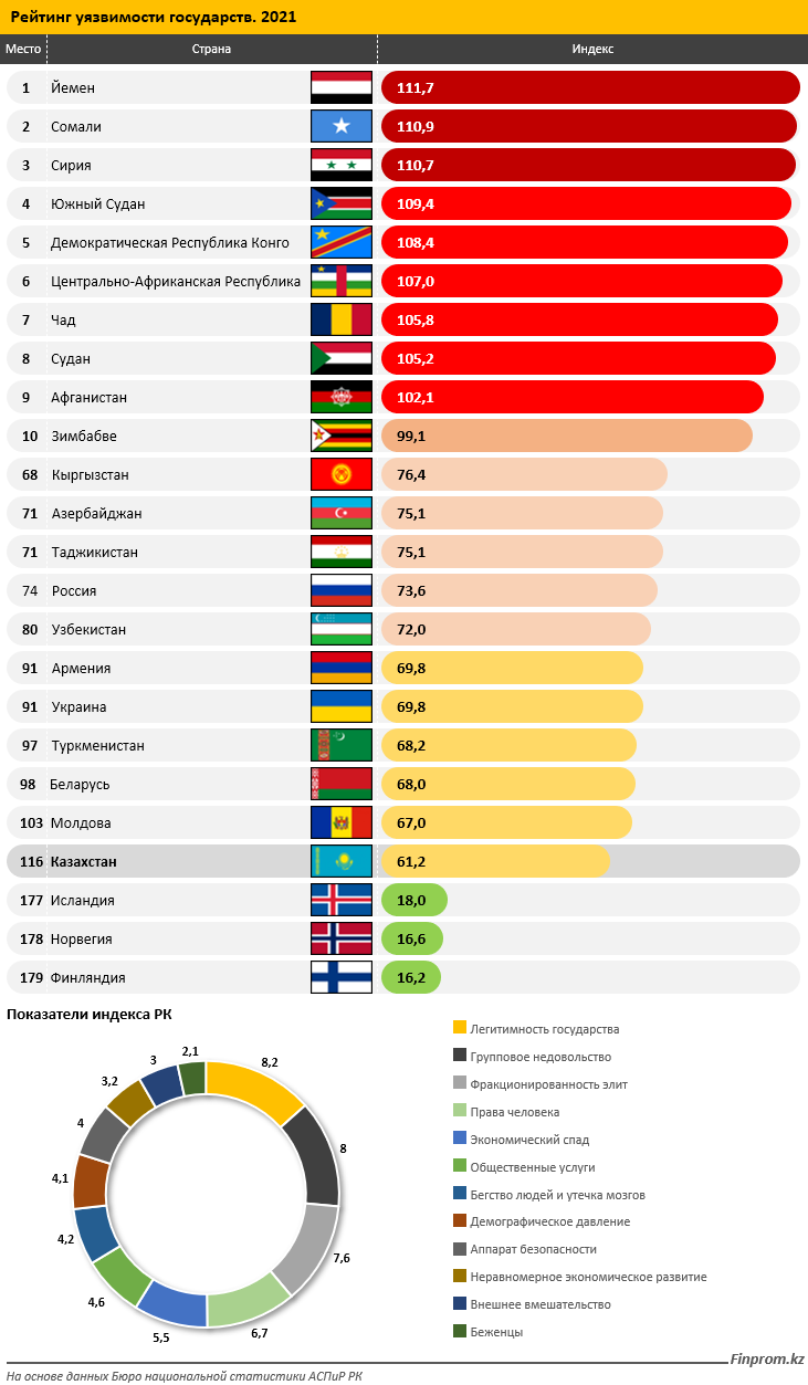Как уточняет аналитический портал, индекс уязвимости государств измеряет слабость позиции страны в ситуациях до, во время и после активных конфликтов. Индекс включает четыре направления: сплоченность, экономическое и политическое состояние и социальную сферу — и 12 индикаторов риска конфликта, которые используются для измерения уязвимости страны: аппарат безопасности, фракционированность элит, групповое недовольство, экономический спад, неравномерное экономическое развитие, бегство людей и утечка мозгов, легитимность государства, общественные услуги, права человека и верховенство закона, демографическое давление, беженцы, внешнее вмешательство. Чем выше значение индекса, тем более уязвимой и слабой является страна.
