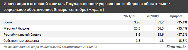 За январь–сентябрь 2021 года инвестиции в основной капитал в сфере государственного управления и обороны, а также обязательного социального обеспечения в РК составили 33,6 млрд тг — на 35,1% меньше, чем годом ранее (реальный спад физического объёма — на 37,4%).