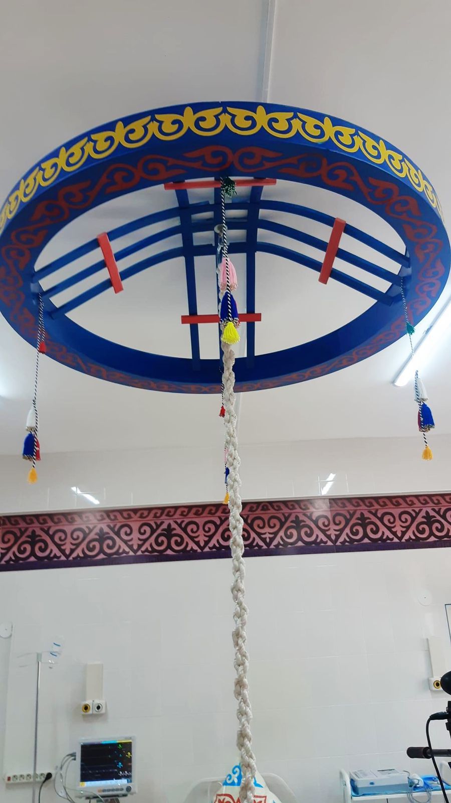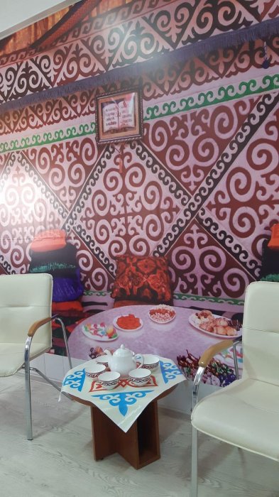 С ее слов родильный зал полностью оборудован техническими средствами. При этом в нем гармонично сочетаются современный тренд и древний быт казахов: сакральный шанырак, внутреннее убранство юрты, канат, бакан, казан, домбра – каждая эта вещь выполнена с сохранением красоты орнамента и символизирует национальные традиции и культуру.