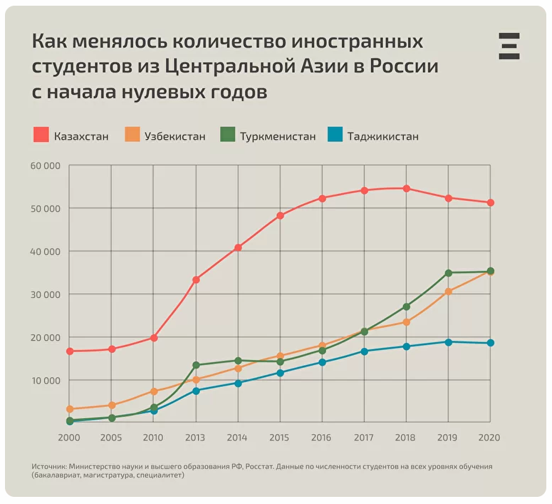 Как отмечают авторы, Россия — один из мировых лидеров по числу иностранных студентов. В российские вузы приезжают учиться как из стран СНГ, так и из дальнего зарубежья — в десятку, помимо бывших советских республик, входят Китай и Египет. Но почти каждый второй студент, приехавший учиться в Россию, — гражданин Казахстана, Узбекистана, Туркменистана или Таджикистана. Они составляют 47 процентов от общего числа иностранных студентов.
