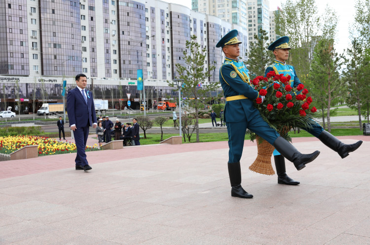В Астане Премьер-министр Казахстана Олжас Бектенов в рамках празднования Дня Победы принял участие в церемонии возложения цветов к памятнику Халық Қаһарманы Рахымжану Кошкарбаеву, водрузившему знамя при штурме Рейхстага в Берлине, передает агентство Caravan.kz со ссылкой на пресс-службу Правительства РК.