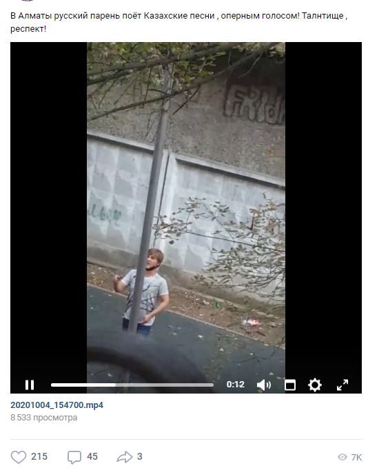 «В Алматы русский парень поет казахские песни оперным голосом. Талантище, респект», — поделился участник группы, запечатлевший необычного певца в одном из дворов мегаполиса.
