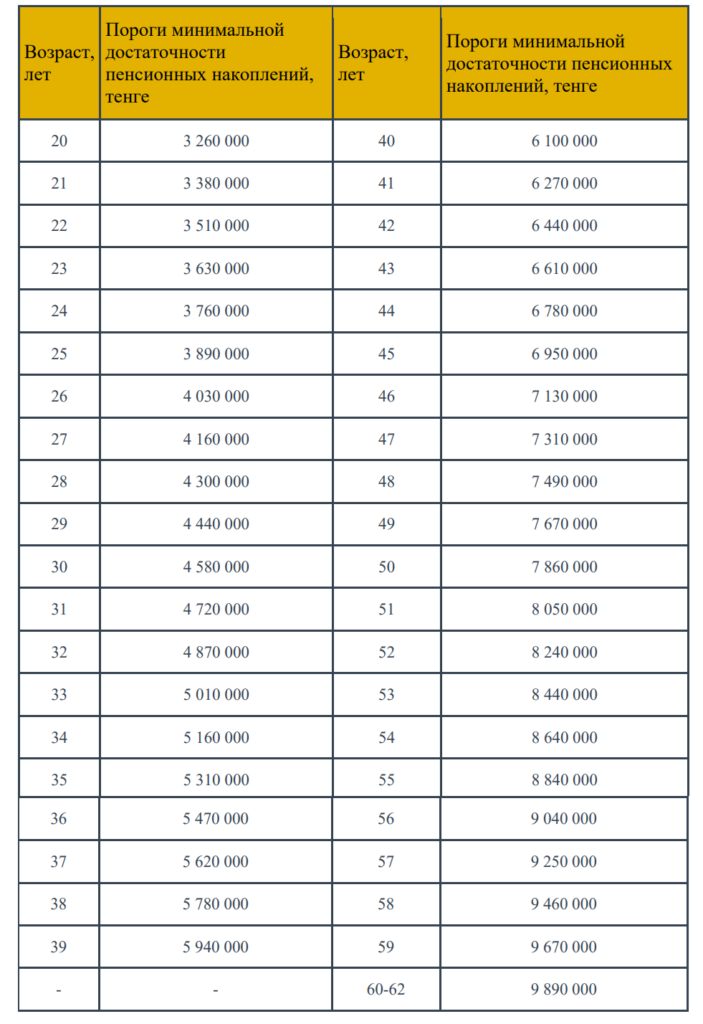 По данным ведомства, в 2025 году пороги достаточности не изменились, как и в 2024 году. В зависимости от возраста граждан, сумма колеблется 3-10 млн тенге. Более подробную раскладку можно увидеть в таблице.