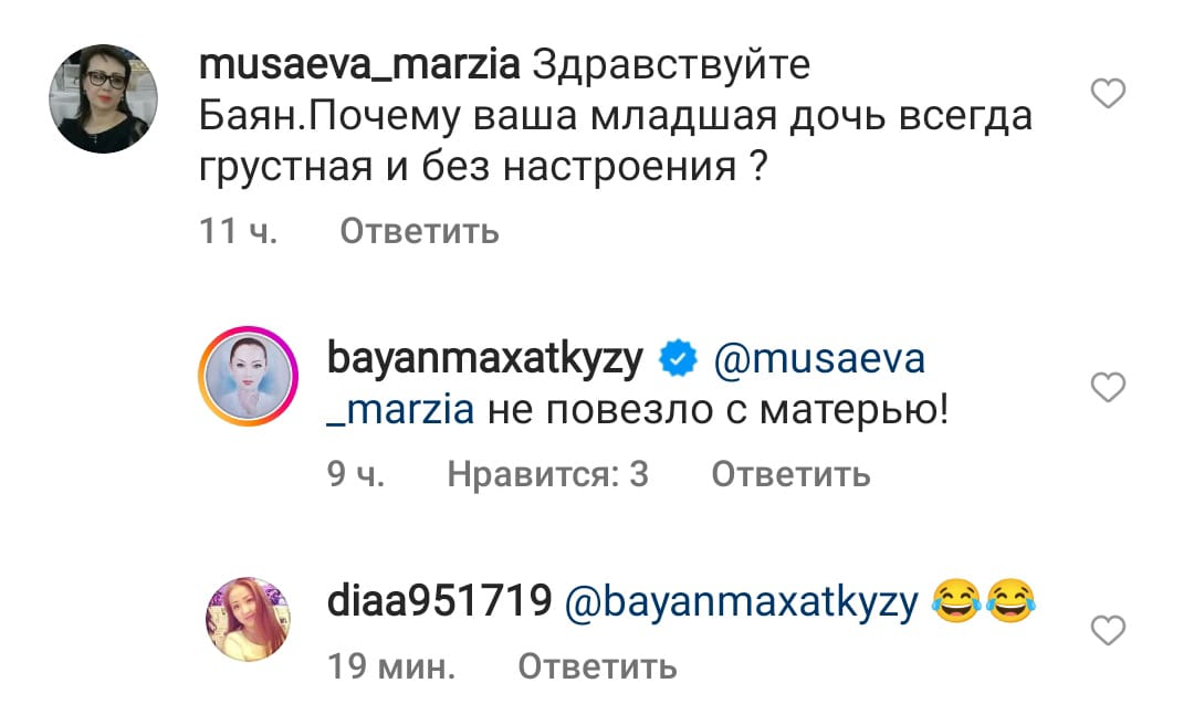 Баян Алагузова опубликовала совместное фото с обеими дочерьми, передает медиа-портал Сaravan.kz. Под снимком ее спросили, почему Айару на фото всегда выглядит грустной и без настроения. Продюсер назвала причиной то, что Айару не повезло с матерью, насмешив остальных подписчиков.