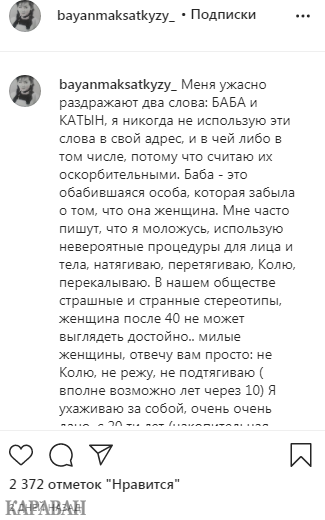 «Я очень уважаю Баян Алагузову за ее достижения на творческом поприще и за множество талантов, которые она раскрыла в ходе своей продюссерской деятельности. Сегодня я остался недоволен ее следующим заявлением: «Меня ужасно раздражают два слова — БАБА и ҚАТЫН. Я никогда не использую их ни в свой адрес, ни в чей-либо еще, потому что считаю их оскорбительными.". Конечно, к слову «баба», мы не имеем никакого отношения. А вот слово «Қатын» — это наследие наших предков. Никто не имеет право упразднять или ревизировать его. Сперва необходимо понять слово «қатын» в положительном ключе. Все тюркоязычные народы называют возлюбленную этим словом. Только совсем недавно относительно известные личности начали выдвигать свои изречения о том, что суровое слово «қатын» применяется баями (прим. бай – крупный землевладец или скотовладелец в Средней Азии). И теперь только казахи и киргизы, запутавшись во всем этом, начали употреблять слово «әйел», «айал» — пишет Калыбек Атжан.