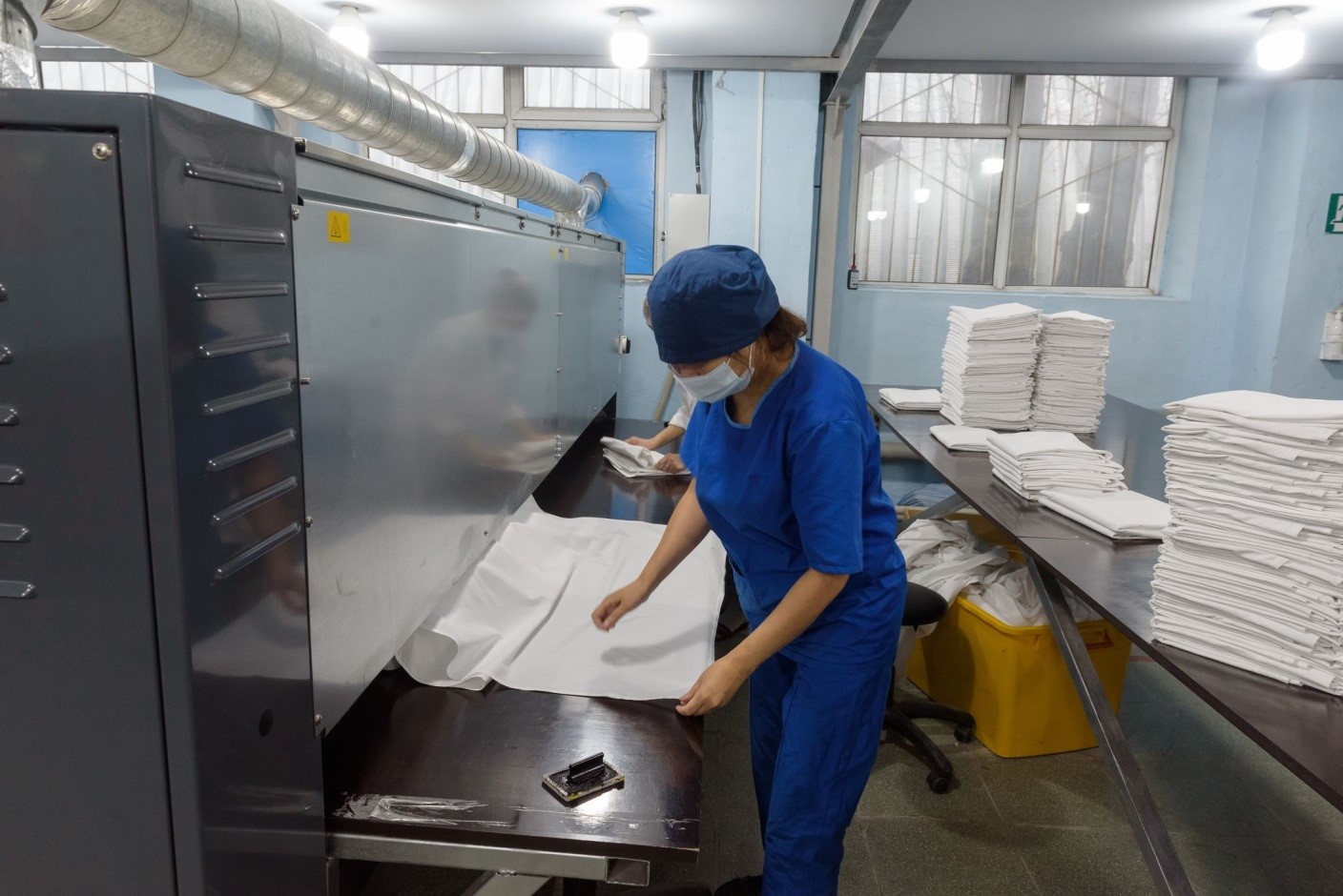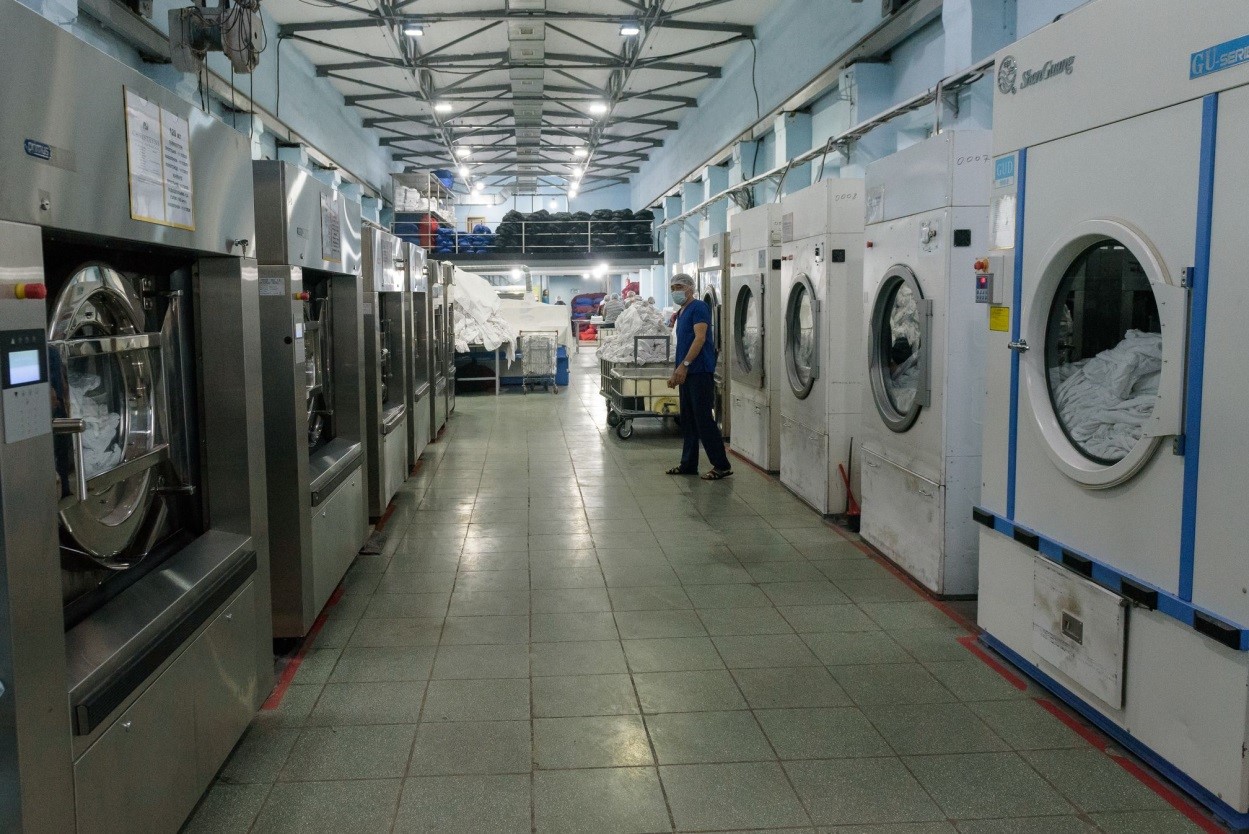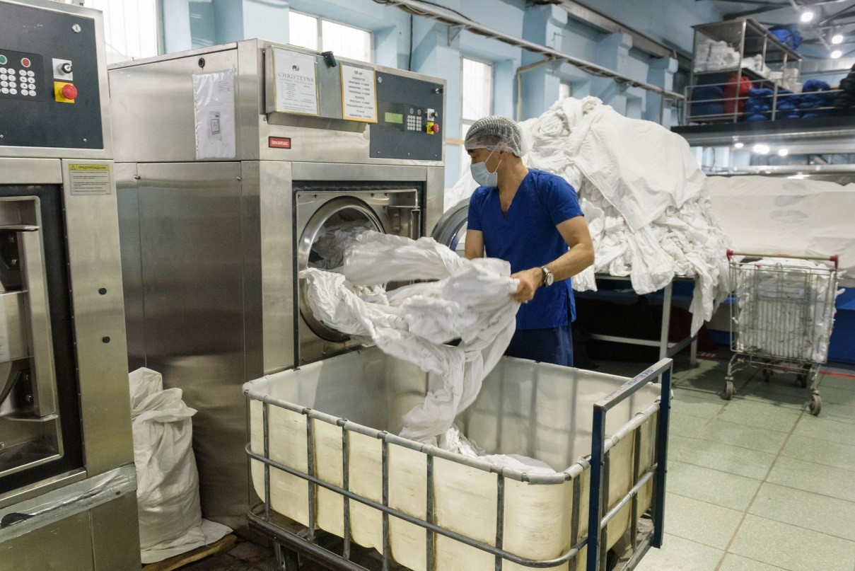 После сушильной машины постельное белье отправляется на глажку. Она производится от +170С до +200С. Высокая температура позволяет уничтожать все вирусы и микробы.
