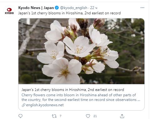 Как отметили в Национальном метеорологическом управление Японии, что первое в этом году цветение началось 11 марта в префектуре Хиросима, сообщает ТАСС.