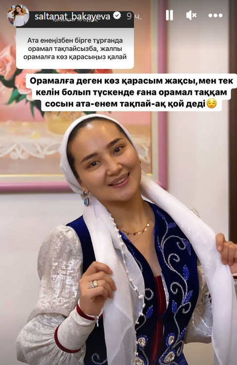 "Отношусь хорошо. Когда только стала единственной келин, я носила платок, а потом родители мужа сказали, чтобы сняла", — ответила артистка.