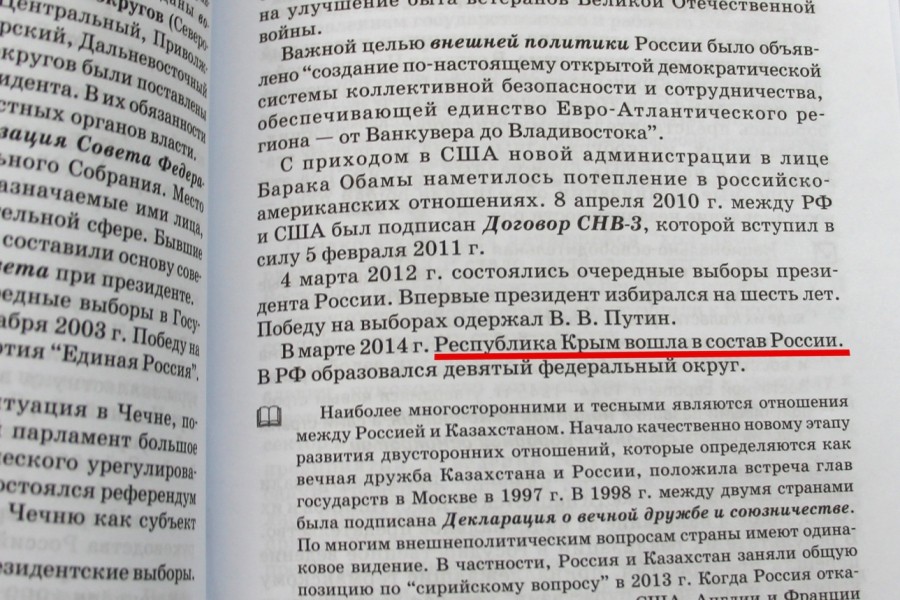 Еще один резонанс был вызван учебником по географии для 11-го класса. В центр внимания попал полуостров Крым. В изданных в 2015 году в казахстанских учебниках по истории и географии сказано, что Крым является собственностью России. Это не понравилось украинской стороне, после чего в МОН РК пришлось экстренно принимать меры. Издательство "Мектеп" понесло убытки, но смогло выпустить приложение к учебнику с поправками еще до того, как тему полуострова начали изучать в школах Казахстана.