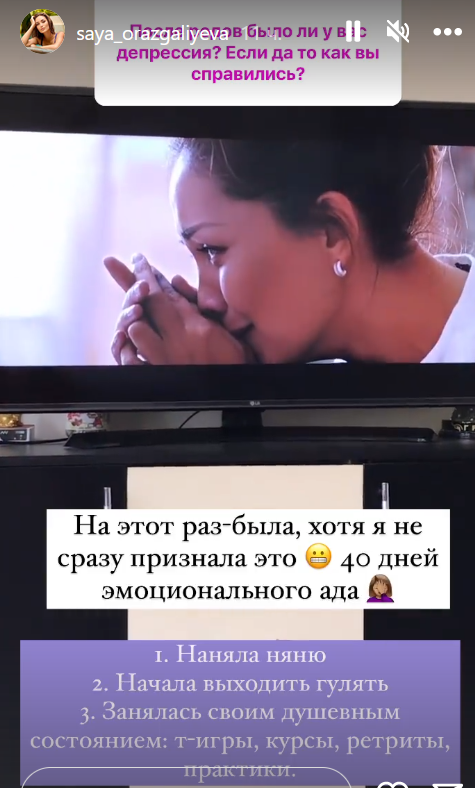 Разница в возрасте между младшими детьми составила чуть больше года, передает медиа-портал Сaravan.kz. Подписчица спросила Саю, была ли у нее депрессия после родов, и если да, как Сая с ней справилась.