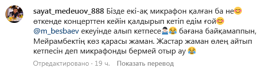"У нас что, всего два микрофона? Я, кажется, оставил их после концерта в прошлый раз, если их Мейрамбек Беспаев не забрал. Я не заметил, а у Мейрамбека дурные взгляды, оказывается. Не дает молодым микрофон, чтобы не пели свои плохие песни", — написал артист.
