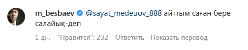 Упомянутый им певец Саят Мелеуов едко высказался по этому поводу в своем Instagram.