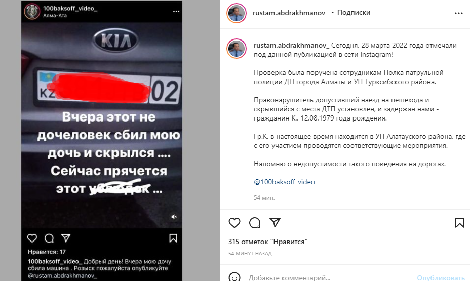 "Проверка была поручена сотрудникам полка патрульной полиции ДП города Алматы и УП Турксибского района. Правонарушитель, допустивший наезд на пешехода и скрывшийся с места ДТП, установлен и задержан нами — гражданин К., 12.08.1979 года рождения. Гр.К. в настоящее время находится в УП Алатауского района, где с его участием проводятся соответствующие мероприятия," — написал замначальника ДП Алматы.