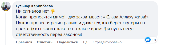 "Ни сигналов нет. Когда проносятся мимо — дух захватывает: Нужно провести регистрацию и даже тех, кто берёт скутеры напрокат (кто взял и с какого по какое время!), и пусть несут ответственность перед законом!", " Тротуар опасен для прогулок. Мамы с колясками, детишки на велосипедах. А самокатчики несутся по тротуару", "Были же дорожки для велосипедистов, вот по ним и пусть ездят на самокатах, и узаконить штрафы за выезд на тротуары", "Почти такая же ситуация была у меня в прошлом году , чуть собаку не потеряла(( когда уже возьмутся за этих беспредельщиков на самокатах?!" — пишут жители Алматы в комментариях.