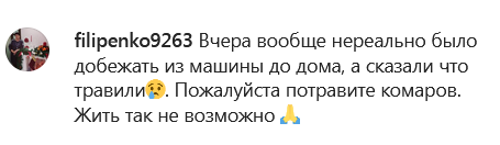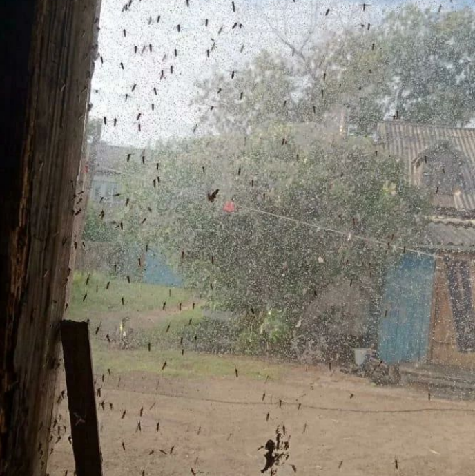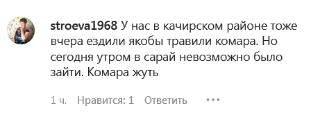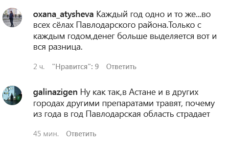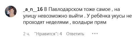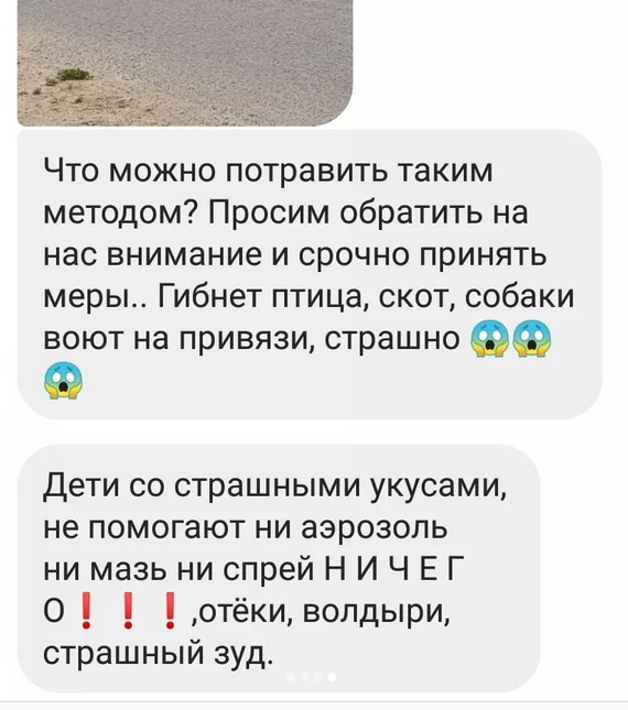 "Село Мичурино и ГПС — страшный гнус, заедает скот, птицу, людей. На улицу не выйти, ни в огород, ни в магазин, невозможно стоять на автобусных остановках, съедают насмерть… При этом рядом соседнее село Павлодарское, там совсем другая картина. Комаров нет, а мошка ещё не вылупилась… Это как получается, что травят одинаково, но кому-то помогло, а кому-то нет?" — говорится в подписи к снимкам.