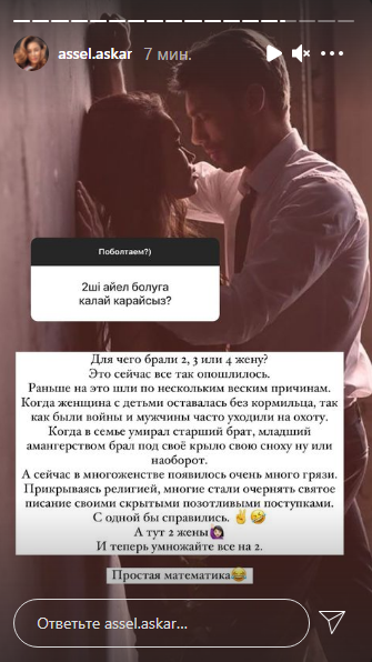 Подписчик спросил Аскар её мнение о том, что иногда мужчины берут себе вторую жену, и она ответила:
