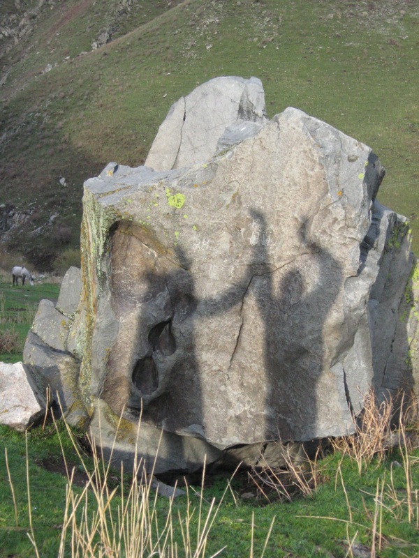 На верхней скошенной поверхности камня – геометрический рисунок какого-то сооружения и загадочные буквы, складывающиеся в таинственный текст. О присутствии древних поселений вокруг стелы напоминают стертые временем рисунки животных на небольших камнях вдоль дороги.