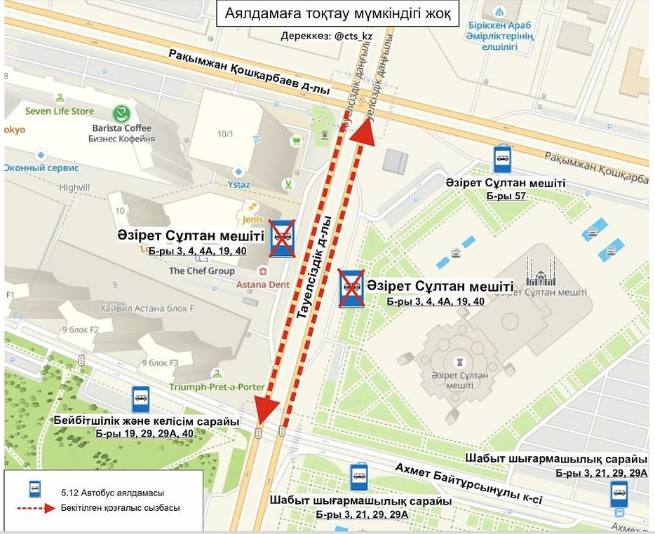 В связи с проведением дорожных работ перекрыт проезд к остановочному пункту "Әзірет Сұлтан мешіті" по пр. Тәуелсіздік в обоих направлениях.