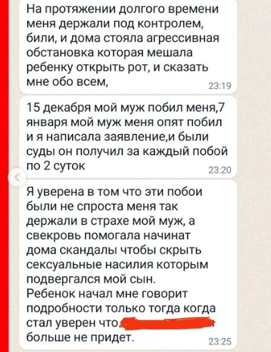 "Брат отчима совершал сексуализированные преступления в отношении мальчика семи лет. Ребёнок от первого брака", — написали в посте. Также сообщается, что женщина подвергалась побоям и агрессии со стороны мужа и его родственников, в том числе — будучи беременной и после родов с кесаревым сечением. Она даже совершала попытку самоубийства, но врачи её спасли, а когда она вернулась домой, всё продолжилось.