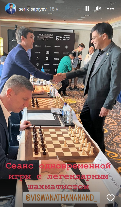 "Сыграл в шахматы с легендарным гроссмейстером, 15-м чемпионом мира Вишванатаном Анандом. Дебют партии был равным, но матч закончился, конечно, в пользу Виши. Был очень рад впервые поиграть с чемпионом мира по шахматам. Напомню, что в Астане проходит матч за звание чемпиона мира по шахматам, и в рамках соревнования организован ряд мероприятий, среди которых сеансы одновременных игр с международными гроссмейстерами. Выражаю благодарность Федерации шахмат РК за возможность сыграть этот матч!" — написал Сапиев в Instagram.