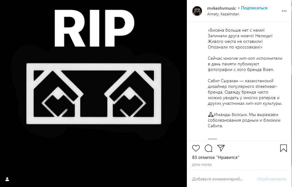 19 октября в СМИ появилась информация, что в Алматы скончался известный казахстанский дизайнер Сабит Bisen. Об этом ужасном случае рассказал популярный алматинский рэп-исполнитель Hiro, который дружил с почившим дизайнером. По его словам, молодого человека убили.