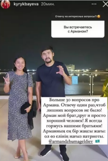 «Более тридцати вопросов касаются Армана. Позвольте мне ответить на них самой, чтобы мы не говорили об этом позже. Арман — мой брат, друг и просто хороший человек. Я всегда горжусь своими братьями. Одна из хороших черт Армана в том, что он патриот своей страны», — написала Кырыкбаева.