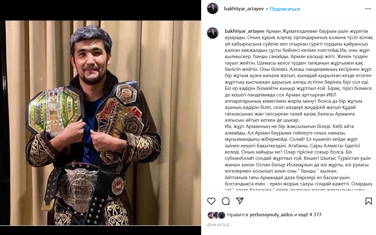 Однако Дикий Арман связан не только со спортом. Редакция медиа-портала Caravan.kz выяснила, кто еще поддерживал Дикого Армана публично.