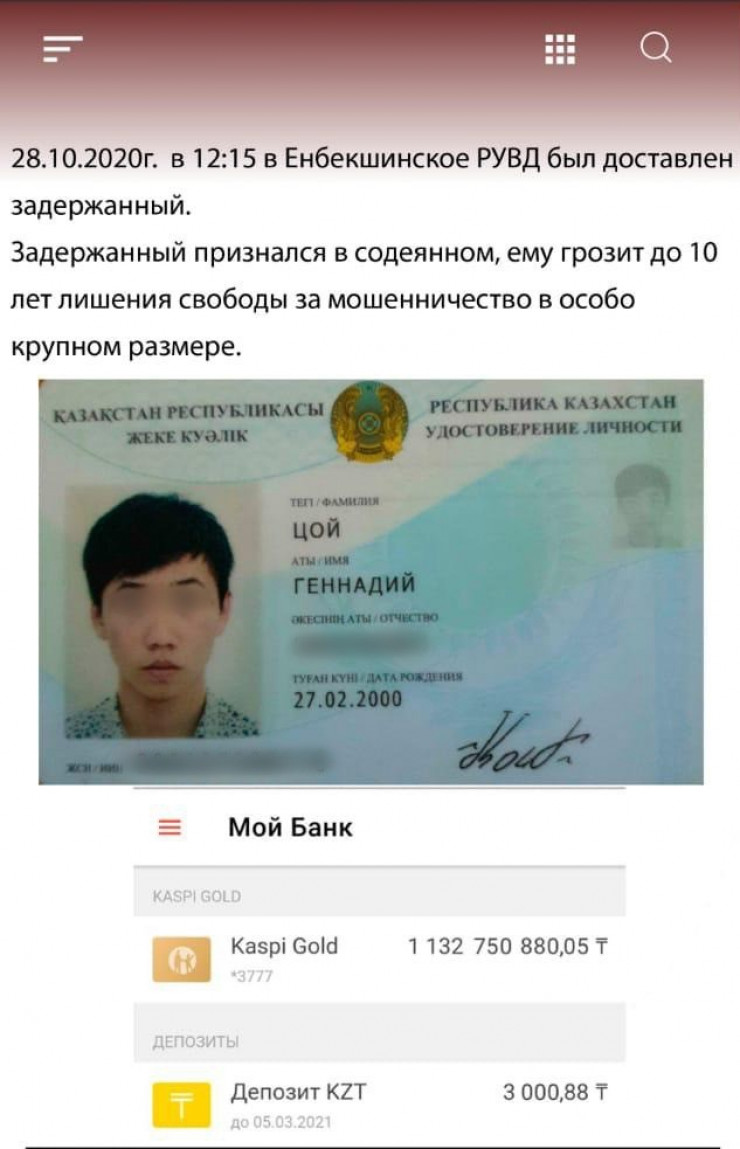 "28 октября 2020 года в 12.15 в Енбекшинское РУВД (Шымкент) был доставлен задержанный. Задержанный признался в содеянном, ему грозит до 10 лет лишения свободы за мошенничество в особо крупном размере", — говорится в рассылке.
