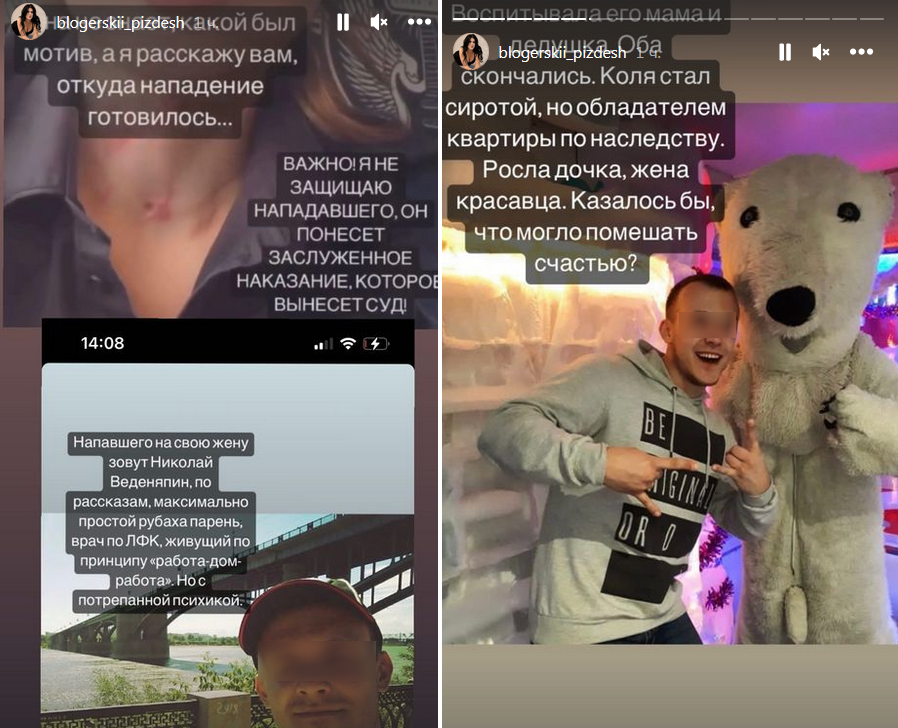 Ранее Ирина Веденяпина обвинила Николая, своего мужа и отца их маленькой дочери, в нападении, передает медиа-портал Сaravan.kz. По словам Ирины, он попытался зарезать ее, пока она спала в одной кровати с ребенком. При этом, когда девочка проснулась, Николай накрыл ее одеялом, чтобы она не видела происходящее. Потом Ирина с трудом уговорила мужа вызвать скорую помощь и долгое время находилась в больнице на лечении резаных ран. Ирина также рассказала, что ее мать помогает Николаю, которого жалеет из-за выдуманной им измены Ирины, и даже взяла кредит на оплату услуг его адвоката, а также, что Николай планирует продать свою квартиру, которая не будет делиться при разводе. Женщина заявила, что предала огласке произошедшие в мае события, так как статью, по которой ведется дело, переквалифицировали с "покушения на убийство" на "нанесение тяжких телесных повреждений", а также из-за страха остаться с ребенком на улице после продажи квартиры.