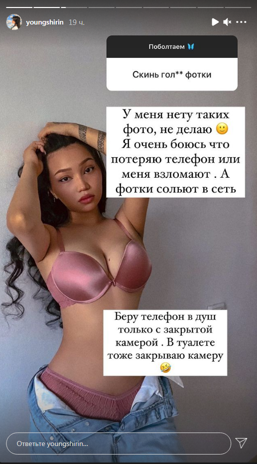 Шырын Нарчаева в сториз в Instagram призналась, что не хранит в телефоне фотографии, на которых обнажена, передаёт медиа-портал Сaravan.kz.