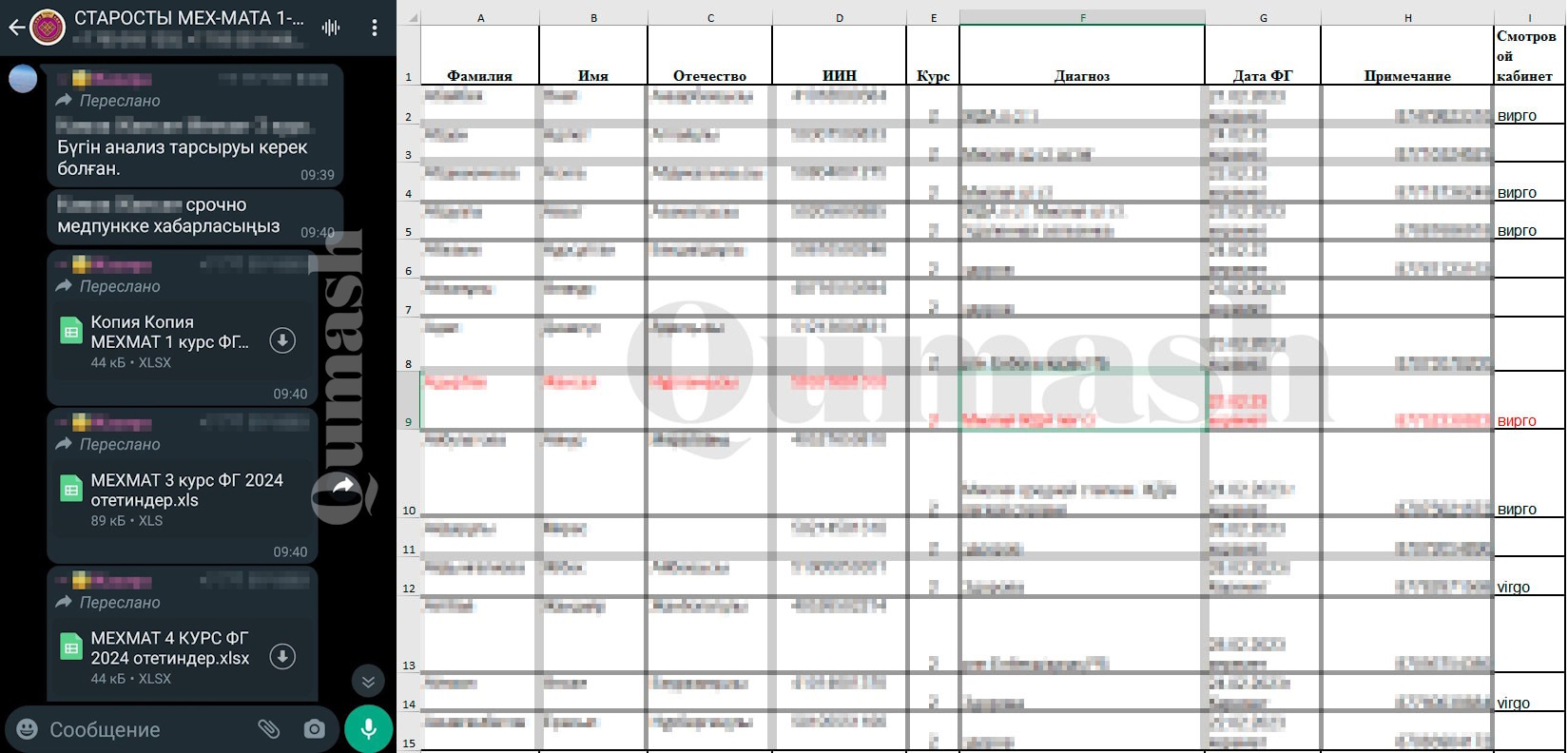 В WhatsApp-группу старост, состоящую из 190 человек, скинули 4 документа со списком студенток (с 1 по 4 курс). Те, кто в нем отмечены красным, должны были сдать флюорографический снимок. И всё бы ничего… Вот только помимо ФИО девушек там были их ИИН, сотовые номера и медданные. А еще, а еще… информация о том, кто из них вирго (на гинекологическом — девственница), а кто уже не вирго. Доки, естественно, расшерились по группам, факультету и так далее. Может, уже весь вуз видел. Кто первым всё это слил, источник наш не знает. Он, как и многие, получил "пересланные сообщения", — говорится в публикации.