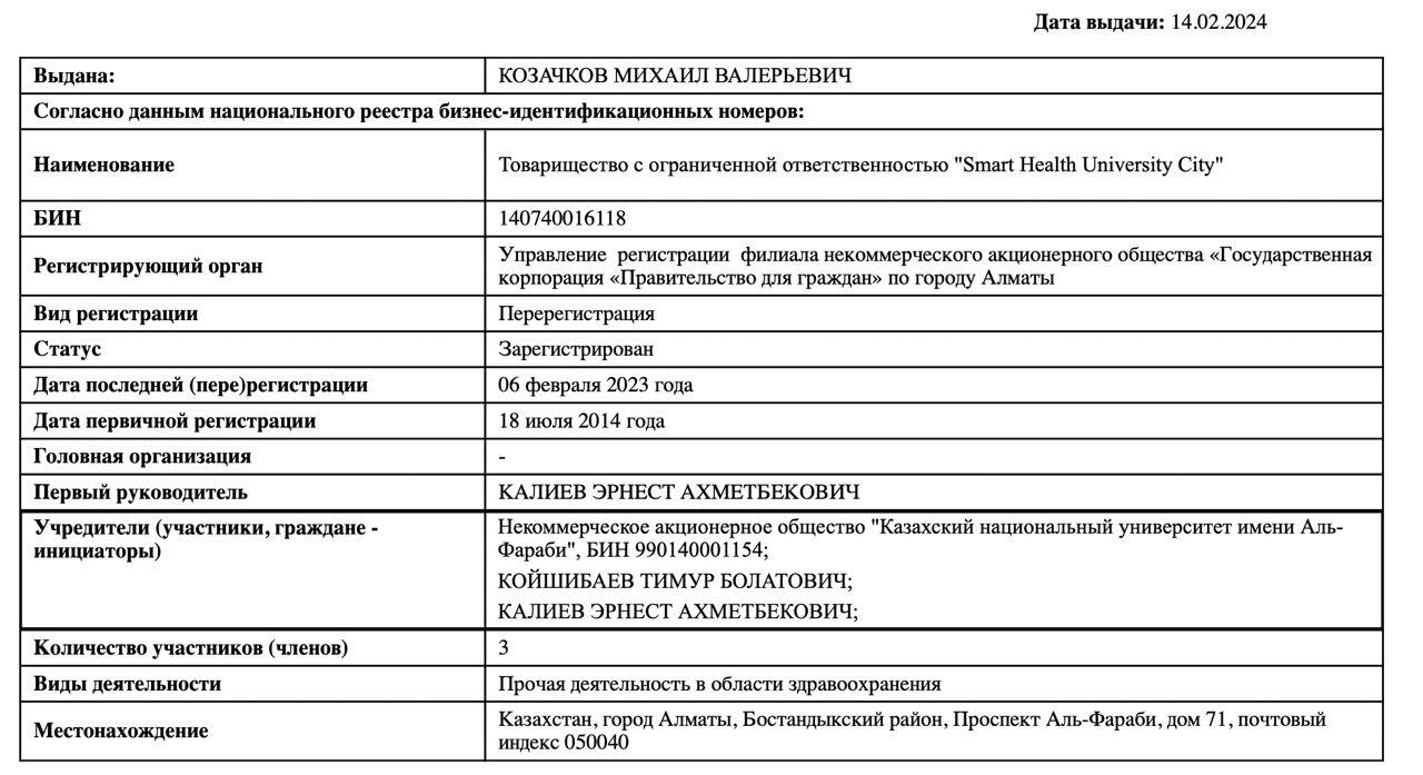 "Ну какая частная клиника? КазНУ имени Аль-Фараби — соучредитель Smart Health University City. Это легко подтвердить.