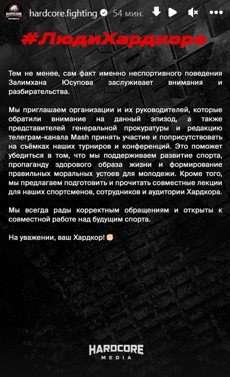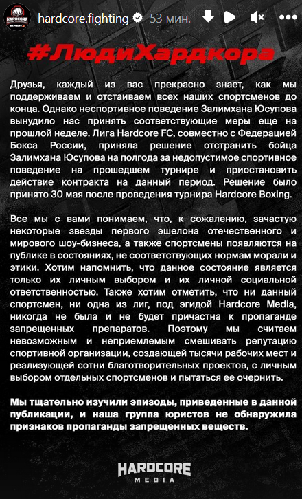 На своей официальной странице в Инстаграм, в разделе «сторис» лига поп-ММА Hardcore Fighting объявила об отстранении Залимхана «Сабмишн Кинг» Юсупова на достаточно длительный период – полгода. Причина – «неспортивное» поведение бойца. Решение об отстранении файтера было принято в конце мая.