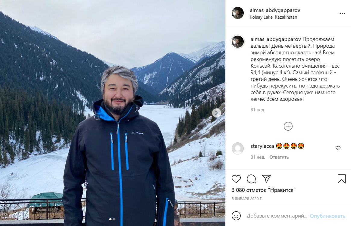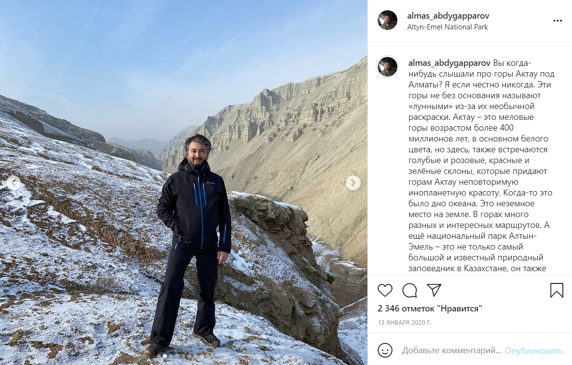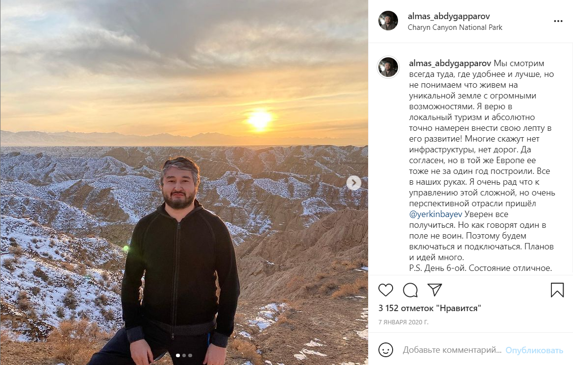 Судя по instagram-аккаунту г-на Абдыгаппарова, он очень любит путешествовать по Казахстану. Посещать такие природные красоты, как национальный парк Алтын-Эмель.