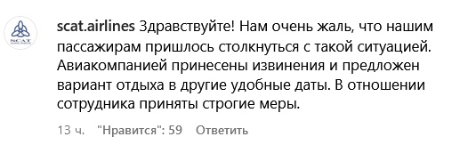 "27 мая 2023 года произошел вопиющий случай, касающийся семьи, воспитывающей ребенка с диагнозом аутизм. Ребенка с диагнозом, а также всю его семью не допустили к посадке на самолет из-за диагноза. Рейс переносили несколько раз. Ребенок был уставший. Сотрудник авиакомпании SCAT посчитала, что ребенок будет мешать другим пассажирам, и не пустила на борт. Сказала, оставьте ребенка кому-то…