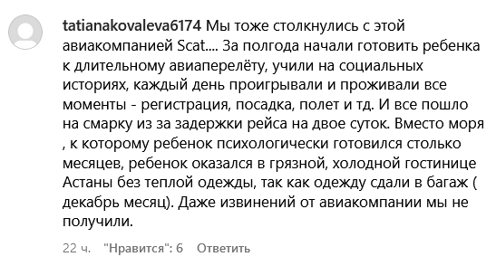 С неприятной ситуацией столкнулась и другая пассажирка, которая собиралась отправиться на отдых с ребенком, которому диагностировали РАС, рейсом Scat.