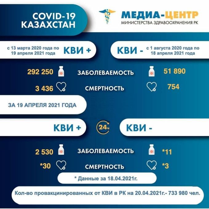 Информацию о заболеваемости коронавирусной инфекцией в РК на 20 апреля представил Минздрав РК, сообщает Caravan.kz.