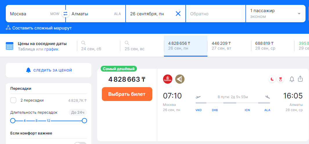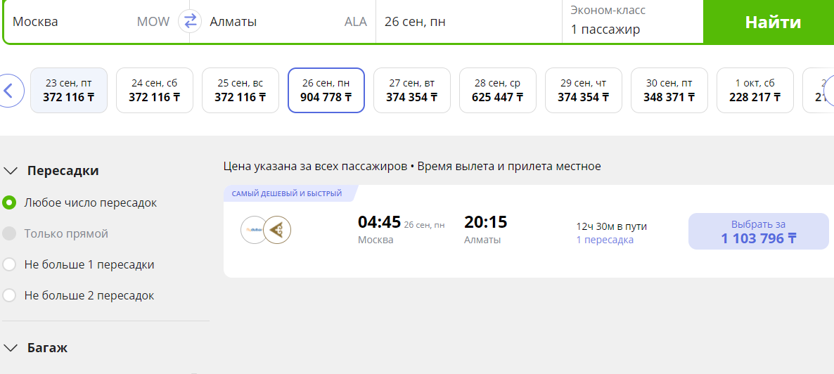 На момент написания материала найти билеты на 23-25 сентября не удалось, на 26 сентября предлагаются цены не ниже 1 млн тенге (более 2 тыс. долларов).
