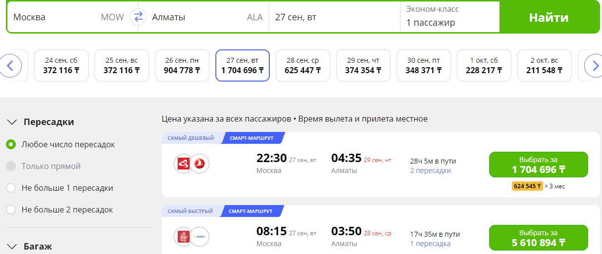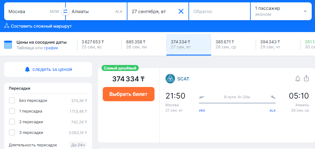 Уже на 27 сентября стоимость значительно снижается и начинается от 374 тыс. тенге (778 долларов):