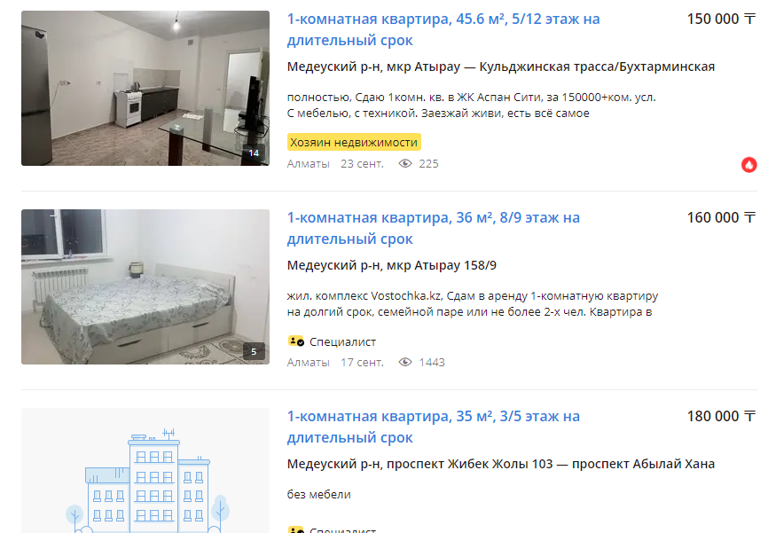 Если арендовать квартиру на длительный срок, то самые дешёвые предложения по меблированным квартирам в Медеуском районе — это 140 тыс. тенге (291 доллар), хотя попадаются и более дорогие без мебели: