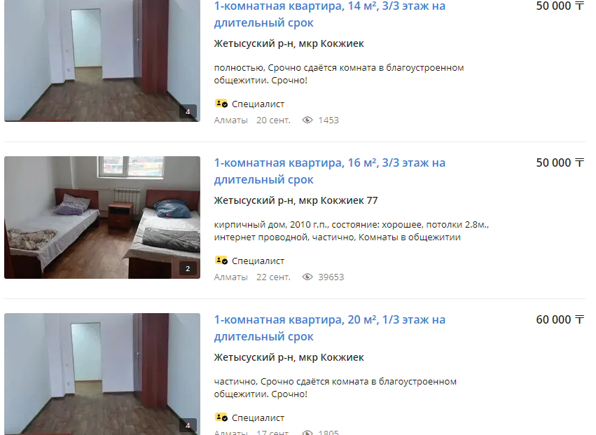 Зато в Жетысуском районе можно найти комнаты в общежитии по 50 тыс. тенге (104 доллара):
