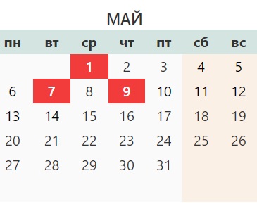 При пятидневной рабочей неделе казахстанцы отдохнут 1 мая, а 2, 3 мая будут работать. Затем 4 и 5 мая отдохнут, а 6-го отработают, 7-го снова отдохнут, 8-го работают, 9-го отдыхают, 10-го работают, 11 и 12 мая — очередные выходные.
