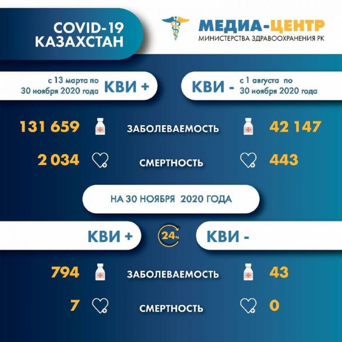 Информация о заболеваемости коронавирусной инфекцией в РК на 30 ноября, сообщает Caravan.kz со ссылкой на Минздрав РК.