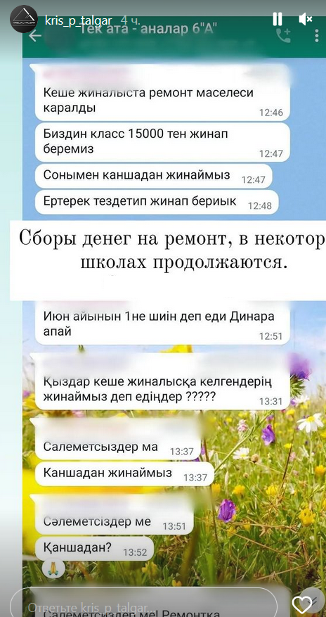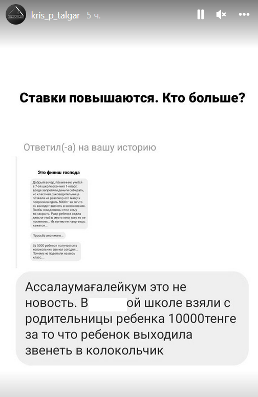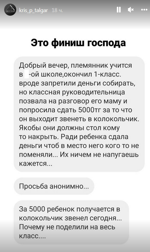 Сначала о проблеме рассказала в паблике kris_p_talgar родственница мальчика из школы в Талгаре, с матери которого классный руководитель потребовала 5 тысяч тенге. Только при этом условии ребенок смог позвонить в колокольчик на школьном последнем звонке. Якобы учителя должны кому-то накрыть стол и поэтому собирают деньги.
