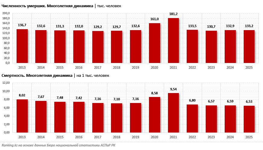 После резкого всплеска в период пандемии (161 тыс. умерших в 2020-м и 181,2 тыс. в 2021 году), демографическая ситуация в Казахстане стабилизировалась, передает Caravan.kz со ссылкой на Ranking.kz.