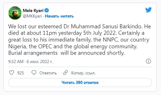 О смерти генсека ОПЕК Мохаммеда Баркиндо сообщил в Twitter глава Нигерийской национальной нефтяной корпорации (NNPC) Маллам Меле Кьяри, сообщает Zakon.kz.