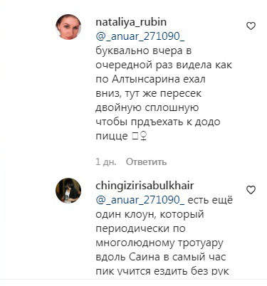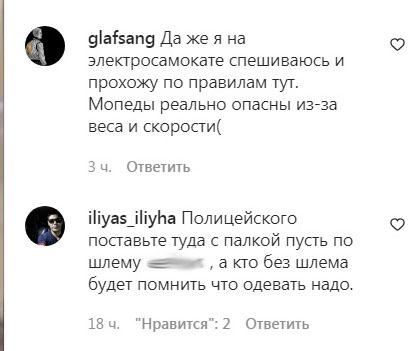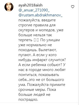 — Зачастую случаются незначительные, на первый взгляд, происшествия. Немало прохожих жалуются на то, что едва не попали под колеса либо скутера, либо самоката. Не всегда получается уворачиваться от излишне резвого скутериста, либо и вовсе бесшумного самокатчика. Хотя по правилам, все эти приспособления с небольшими двигателями приравниваются к мопедам, а их водителям (самокатчикам, скутеристам, моноколесистам и т.п.) вообще запрещено ездить по тротуарам, в отличие от велосипедистов, которым ПДД это разрешают при условии, что они не создают помех пешеходам. Нарушителям же грозит штраф в размере 15 МРП. Трехлетнего ребенка на самокате сбил водитель во дворе дома в Нур-Султане