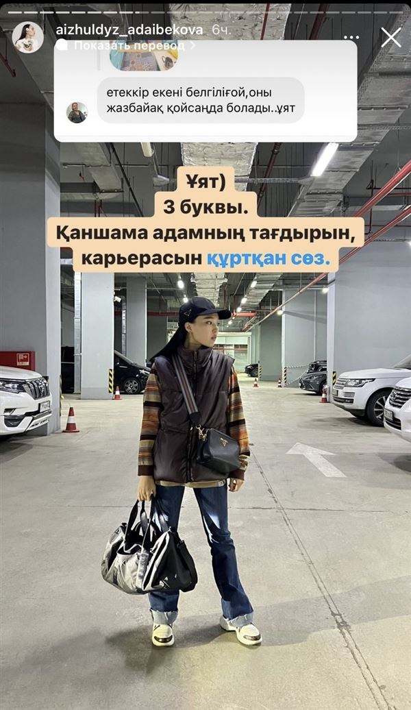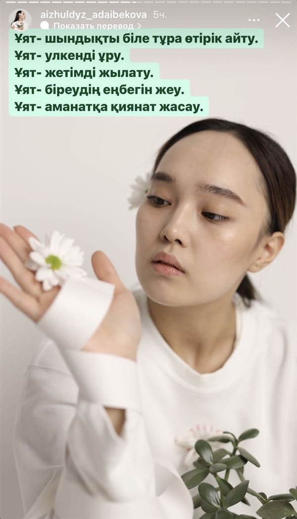 "Ұят. Три буквы, Слово, которое разрушило столько судеб, карьер. Ұят — это лгать, зная правду. Ұят — это бить пожилого человека. Ұят — это заставлять сироту плакать. Ұят — это пользоваться плодами чужого труда. Ұят — это злоупотреблять доверием", — написала в ответ Айжулдыз.