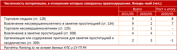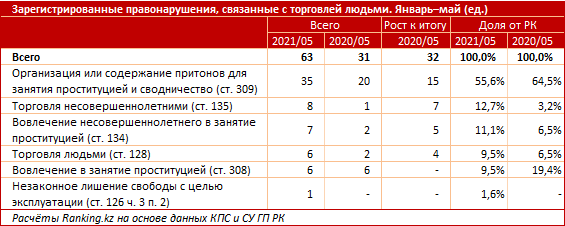 "Еще восемь случаев пришлось на торговлю несовершеннолетними, семь случаев — на вовлечение несовершеннолетних в занятие проституцией, по шесть случаев — на торговлю людьми и вовлечение в проституцию, один случай — на незаконное лишение свободы с целью эксплуатации", — говорится в исследовании.